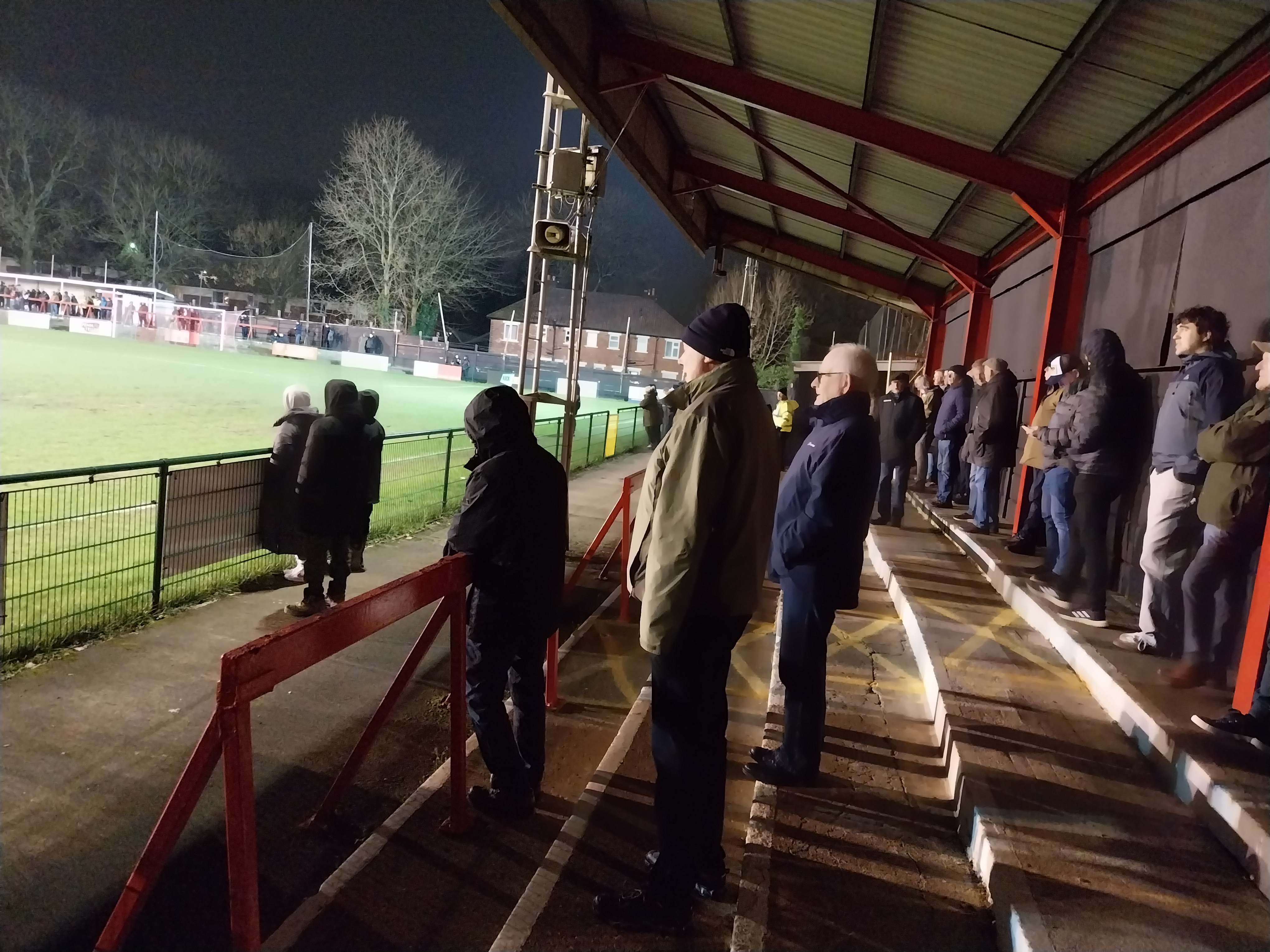 The bar is on the right as you enter the turnstiles. To the left is the main stand, modern in look yet full of stanchions. It can’t be more than 25 yards long. Then comes some terracing, which sweeps round the rest of the ground, between 4 and 8 steps deep. The other 3 sides all have cover, to a varying degree. To the left, a small white structure at the top of the steps, to the right, what looks like one long bike shed. There’s no rain, so everyone’s out in the open. The far touchline has a cover along most of it, and we take a pew here 2nd half.