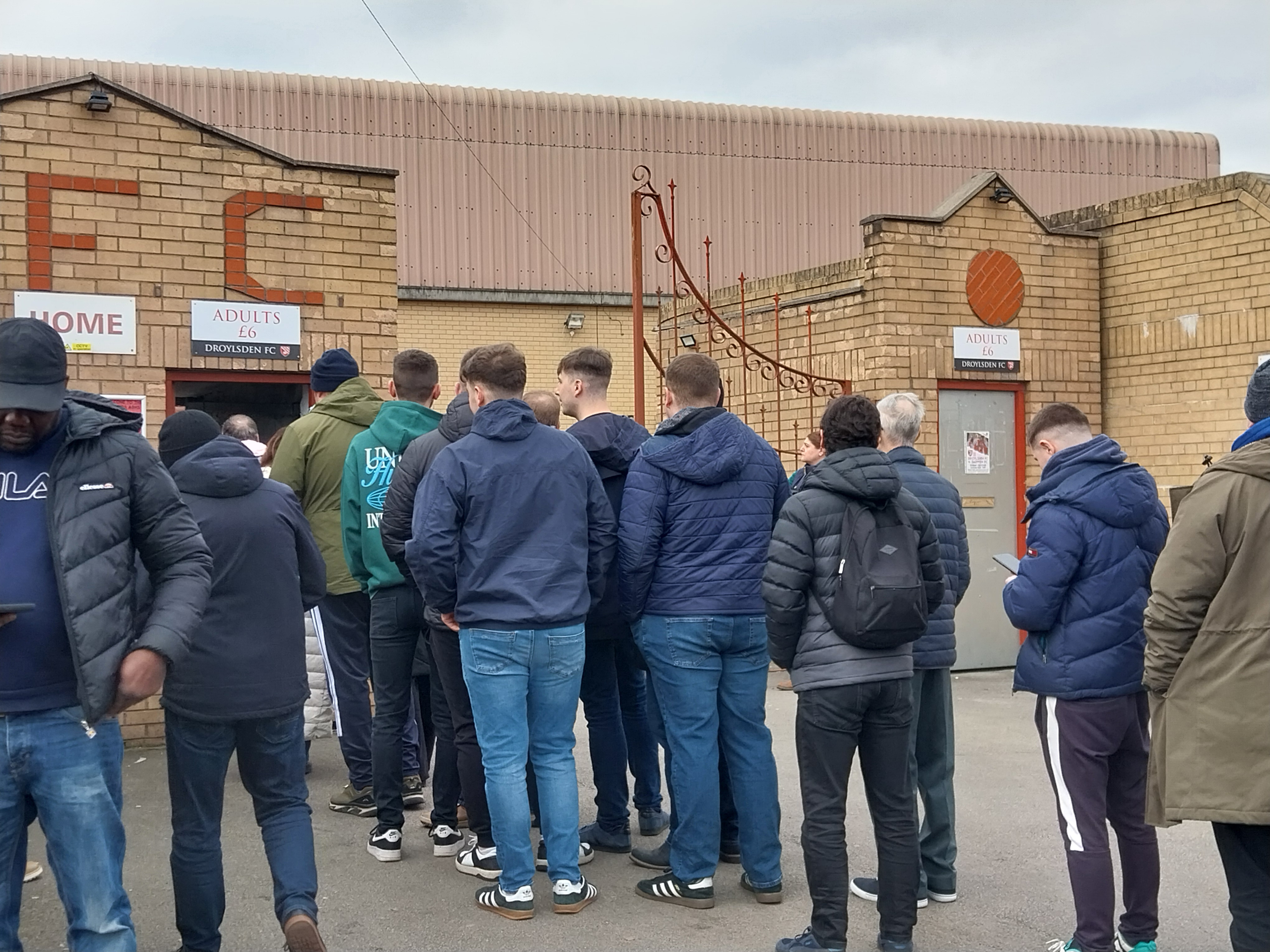 Again, Kev led the way on directions. He’s getting better at this, and we pass Droylsden’s Butcher’s Arms Ground before parking up on a side street. All good, though the football club appears surprised by numbers; only 2 turnstiles open and with one for concessions, a healthy queue snakes down the street until someone has the common sense to make both turnstiles open for all. The groundhoppers’ coach had also arrived, and well done DFC for furnishing everyone with teamsheets as they decanted the bus.